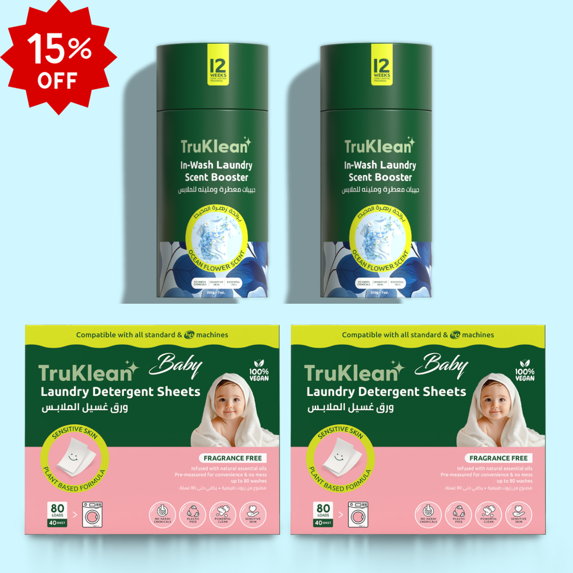 تتضمن مجموعة TruKlean أوراق خالية من الروائح آمنة للأطفال ومجموعة من 3 معززات للرائحة & المعزي 2 في 1.